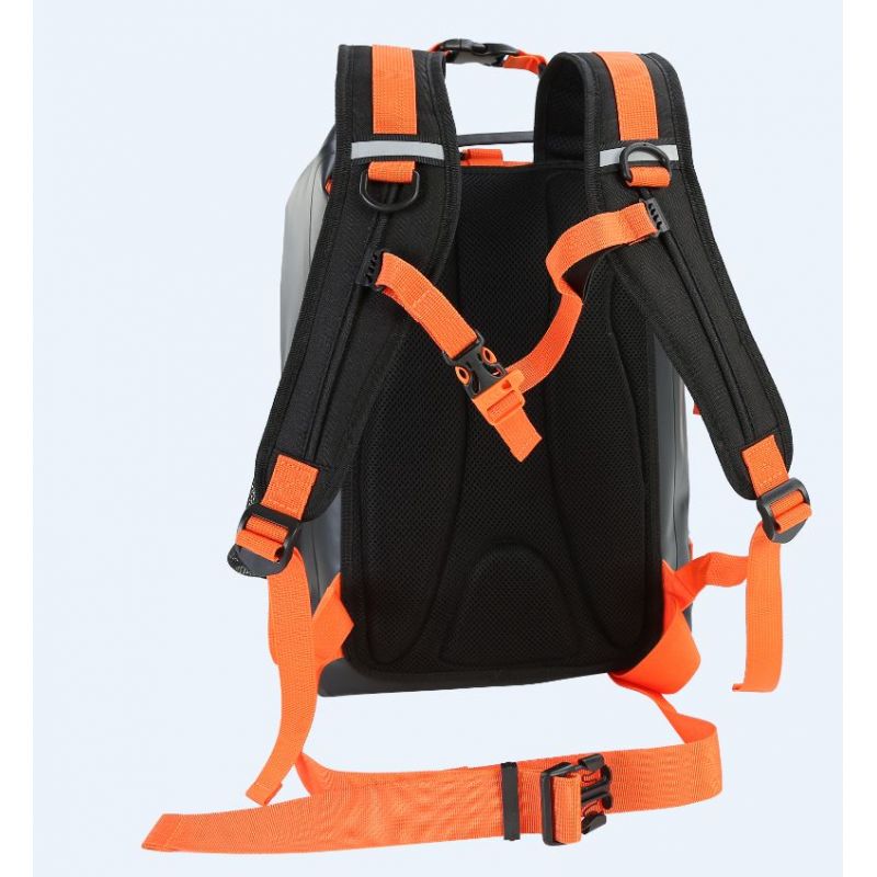 Sac rectangulaire imperméable avec poche filet latérales. Fermeture par enroulement et clips rapides. Portage sac à dos avec bretelles et protections dorsales matelassées. Élastique avec cabillot autobloquant sur l'extérieur.